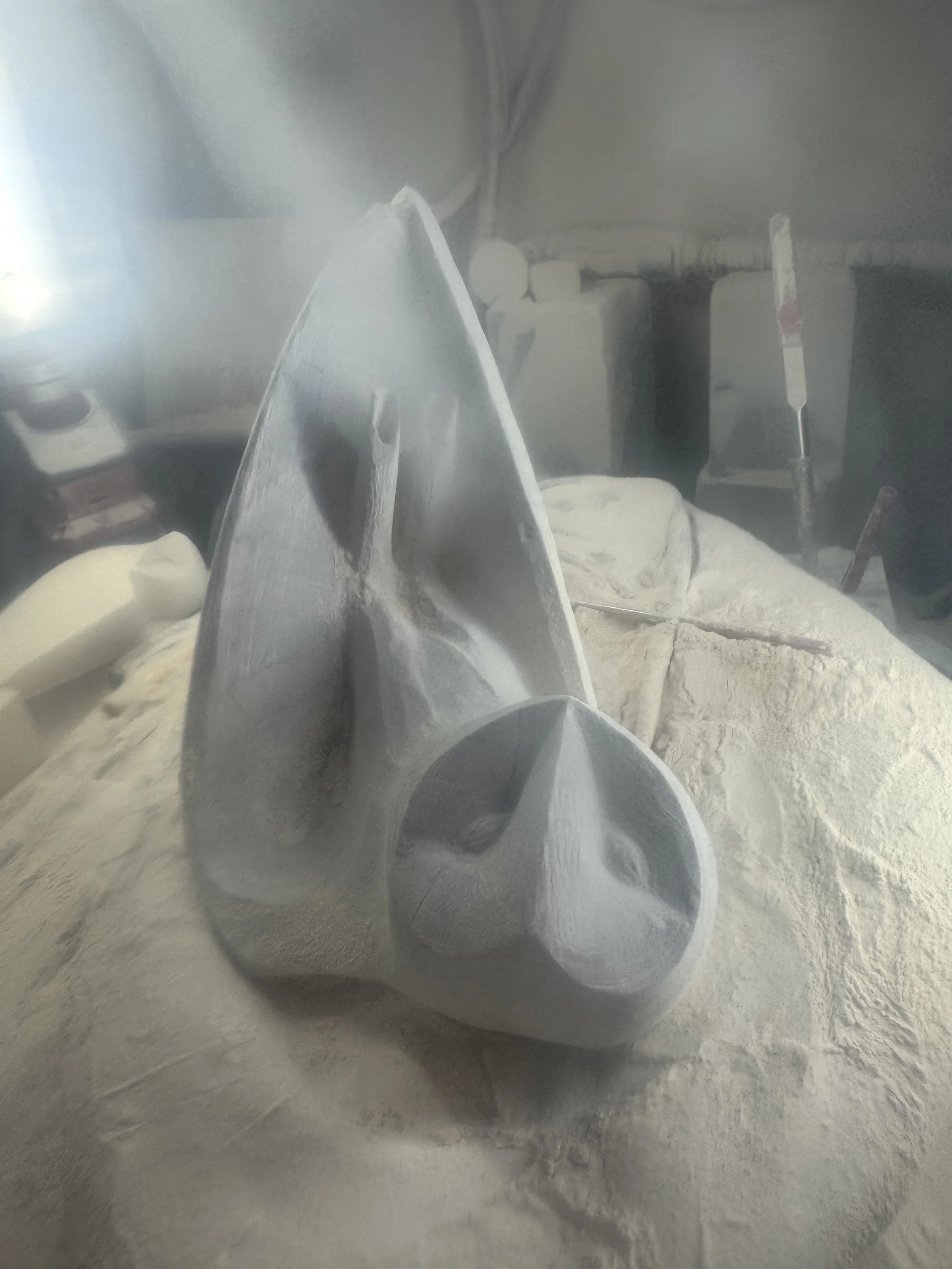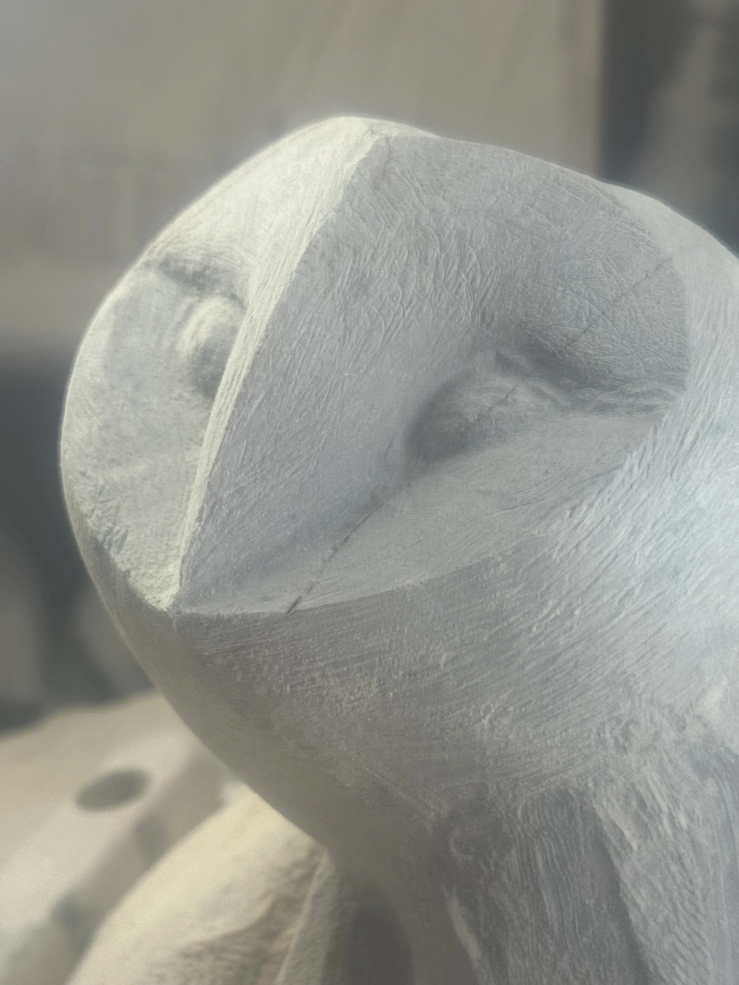 Equipped with a new facemask, a 7” Makita grinder, fresh hand tools, and a custom carving table, I set to work in the studio. The first stage was intense—the grinder raising so much dust I could hardly see until it settled, even with my dust collection system running. Step by step, I shifted to finer burrs and cutters, slowly shaping the fragile stone into something true to the vision.
